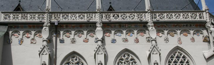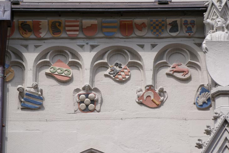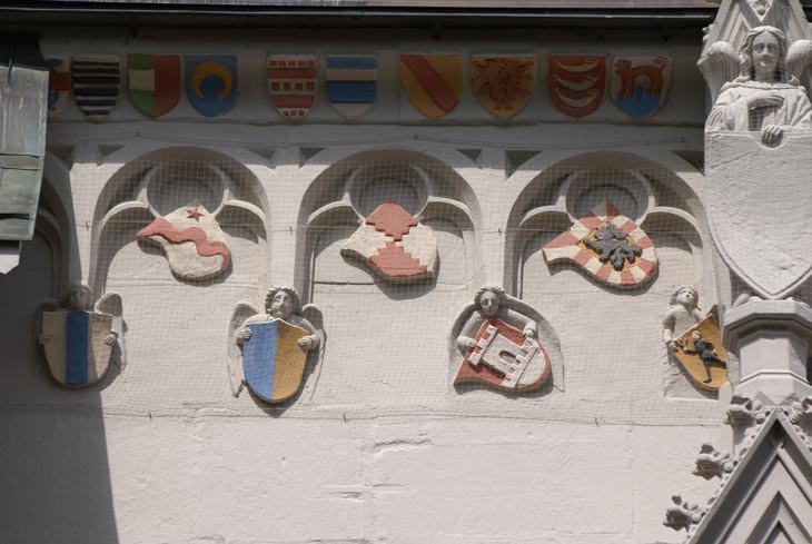 Die Deutungen der Wappenschilde gehen im wesentlichen auf Forschungen von Heideloff zurück, der anscheinend bei der Restaurierung einige Wappen auch in seinem Sinne "verdeutlichte", so daß der Fries nicht mehr hundertprozentig als authentisch angesehen werden kann. Zum Ausmaß kommen wir später. Die Originale wurden jedenfalls im 19. Jh. bei der Restaurierung nicht streng kopiert, so daß bei den Darstellungen der Zustand des ausgehenden 14. Jh. nicht verbürgt werden kann, obwohl man ihn hätte bewahren können, aber es war eben damals eine Zeit, in der man noch nicht von denkmalpflegerischer Originaltreue ausgehen kann.