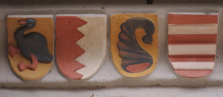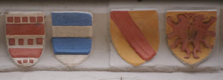 1. Abschnitt: Südseite, erster Wandabschnitt ganz im Westen, ganz links, Detailaufnahmen obere Reihe, rechter Abschnitt, von links nach rechts: Markgrafen von Baden (in Gold ein roter Schrägrechtsbalken; die Helmzier wären zu rot-goldenen Decken zwei rot und golden tingierte Steinbockshörner), von Rechberg zu Hohenrechberg (in Gold zwei abgewendete rote Löwen mit verschlungenen Schwänzen; die Helmzier wäre zu rot-goldenen Decken ein wachsender goldener Hirsch mit rotem Geweih), Grafen von Neuffen (in Rot drei silberne Jagdhörner (Hifthörner) eigentlich noch mit verschlungenem Band; die Helmzier wären zwei aufgerichtete Jagdhörner), Grafen von Löwenstein (in Silber ein auf einem goldenen, blauen (hier gewählt) oder grünen Dreiberg schreitender roter, golden gekrönter Löwe; die Helmzier wäre zu rot-silbernen Decken auf einem goldenen, grünen oder blauen Dreiberg ein schreitender, roter, golden gekrönter Löwe).