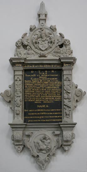 Dieses sandsteinerne Epitaph ist an der Nordostseite des Langhauses zu finden, am zweiten Pfeiler des Hauptschiffes und zwischen den ersten beiden Arkadenbögen, von Südosten gerechnet. Das 1612 geschaffene Kunstwerk ist 2,35 m hoch und 1,22 m breit und in drei Zonen aufgeteilt. Die von zwei mit Trophäen belegten Pilastern mit seitlichen Volutenauszügen eingefaßte Hauptzone besitzt eine eingelassene schwarze Schiefertafel für die in golden gefaßten Lettern ausgeführte Inschrift. Die Sockelzone bzw. Unterhangszone zeigt zwischen den beiden Konsolen ein von Rollwerk eingefaßtes Medaillon mit einem schlafenden, von einem Totenschädel und einer Sanduhr als Memento mori begleiteten Putto. Oben besteht die Bekrönung aus einer großen Rollwerkkartusche zwei liegenden, hersehenden Löwen. Das Epitaph stammt vermutlich aus der Werkstatt des Simmerner Bildhauers Conrad Wohlgemuth.