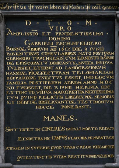 Daraus können wir folgende Fakten über das Leben des hier bestatteten landgräflich hessischen Zollbeamten Gabriel Eschenfelder herauslesen: Er wurde in Bonn geboren. Die im Rheinland von Bonn bis Boppard nachgewiesene Familie hatte zahlreiche Mitglieder, die als Zollbeamte verschiedenen Landesherren dienten. Er war der Urenkel von Christoph Eschenfelder, bekannter Bopparder Zollschreiber und Humanist, Brieffreund von Erasmus von Rotterdam.