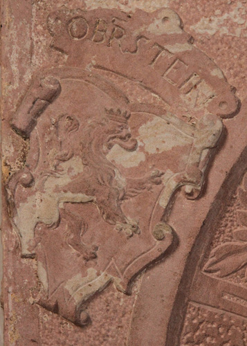 Margarethe von Oberstein (-2.10.1574) war die Tochter des Gundheimer Burgherren Johann Seifrid von Oberstein (1490-19.9.1556) und dessen Ehefrau Margaretha Wilch von Alzey (1500-2.3.1563). Entsprechend zeigt der Schild heraldisch rechts oben das einwärts gewendete Wappen der Herren von Oberstein ("OBRSTEIN"), in Silber ein golden gekrönter roter Löwe (Oberwappen: zu rot-silbernen Decken ein roter, golden gekrönter Löwenrumpf wachsend zwischen zwei silbernen Federstößen), und der Schild gegenüber trägt das Wappenbild der Wilche von Alzey ("WILLICH"), in Blau eine schräggestellte Laute, begleitet von hier sechs (2:2:2) goldenen Lilien (Oberwappen: zu blau-silbernen Decken eine wachsende blau gewandete Mohrin, in jeder Hand eine Pfauenfeder).