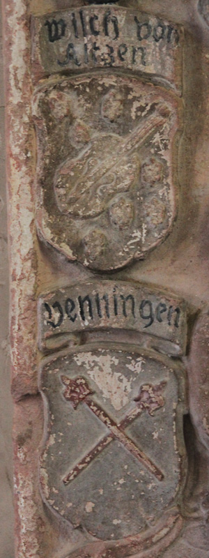 Rosinas Urgroßeltern waren väterlicherseits der Gundheimer Burgherr Johann Seifrid von Oberstein (1490-19.9.1556) und seine Frau, Margaretha Wilch von Alzey (1500-2.3.1563), die wir bereits von der anderen Grabplatte in dieser Kirche kennen. Entsprechend folgt auf der Schwertseite an dritter Position das einwärts gewendete Wappen der Wilch von Alzey ("wilch von / Altzen"), in Blau eine schräggestellte Laute, begleitet von hier sechs (2:2:2) goldenen Lilien (Oberwappen: zu blau-silbernen Decken eine wachsende blau gewandete Mohrin, in jeder Hand eine Pfauenfeder). Die beiden anderen Urgroßeltern väterlicherseits waren Paul Schliederer von Lachen, der zuerst in Deidesheim lebte, und der im Dienste des Speyerer Bischofs stand und der zweimal verheiratet war, erst mit Barbara von Sternenfels (hier nicht relevant), später mit Anna von Venningen. Und deren Wappen sehen wir auf der Schwertseite an vierter und letzter Position ("Venningen"), in Silber zwei rote, schräggekreuzte Lilienstäbe oder Glevenstäbe (Oberwappen: zu rot-silbernen Decken eine silberne Bischofsmütze, mit den schräggekreuzten zwei roten Lilienstäben belegt, oben mit schwarzen Hahnenfedern besteckt).
