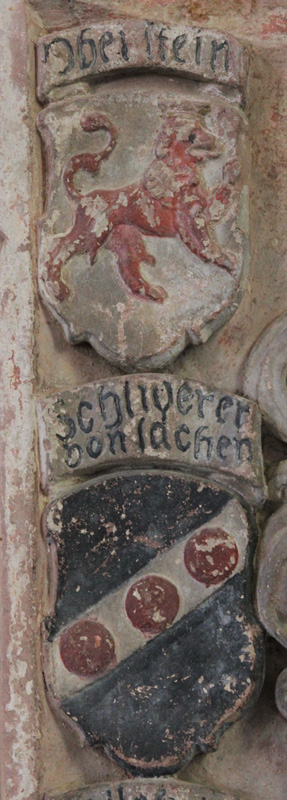 Die Großeltern väterlicherseits waren Jeremias von Oberstein (-1507) und Dorothea von Erlenbach; die Großeltern mütterlicherseits waren Philipp Wilch von Alzey und Helene von Ehrenberg. Entsprechend zeigt der Schild heraldisch rechts unten das einwärts gewendete und stark verwitterte Wappen der von Erlenbach ("(E)RLE(N)BACH", einzelne Buchstaben abgewittert), in rotem Feld eine silberne, golden bewehrte Gans (Oberwappen: zu rot-silbernen Decken der silberne, golden bewehrte Kopf und Hals einer Gans zwischen einem roten Flug). Es ist ein seit dem 15. Jh. erwähntes Geschlecht, das seinen Stammsitz in Erlenbach nördlich von Frankfurt hatte (heute aufgeteilt zwischen Bad Homburg und Frankfurt). Cave - es gibt noch zwei andere Familien des Namens im Nassauischen, die aber andere Wappen führen. Die Familie ist 1507 mit Dieter von Erlenbach erloschen. Der Schild gegenüber trägt das Wappenbild der Herren von Ehrenberg ("ERNBERG", der dritte Buchstabe eine Ligatur aus H und N), in Silber ein roter Adlerflügel, die Saxen nach oben gekehrt, rechts in einen golden geschnäbelten Vogelkopf auslaufend, der Flügel belegt mit einer goldenen Mondsichel (Oberwappen: zu rot-silbernen Decken ein Schaft, oben mit einem Pfauenstoß besteckt, zwischen zwei abgekehrten goldenen Stiefeln)