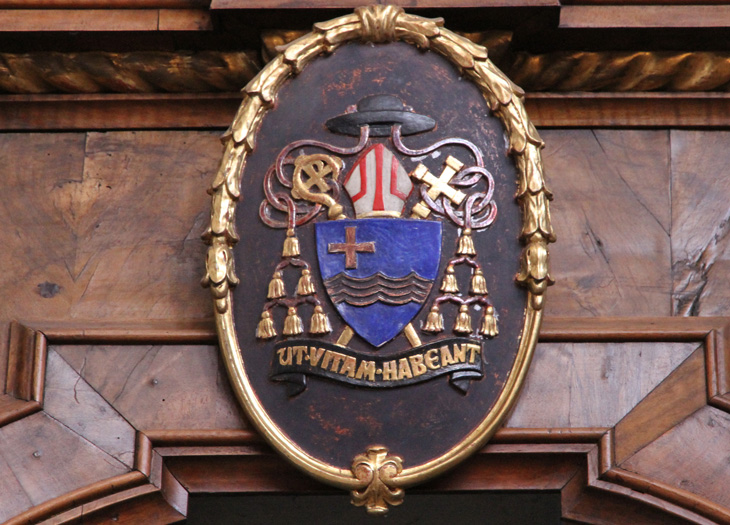 An dem Altar der Schmerzhaften Mutter vom Ende des 17. Jh. an der Nordwand des Langhauses mit einer Darstellung der Pietà ist ein modernes Wappen. Auch wenn die Geschichte von Oestrich-Winkel untrennbar mit den Mainzer Fürstbischöfen verbunden ist, gehört dieses Wappen jedoch zu einem ganz anderen Bistum, nämlich Limburg. Wir sehen das Wappen des Limburger Bischofs Ferdinand Dirichs (24.11.1894-27.12.1948, amtierte 1947-1948), das aufgrund seiner kurzen Amtszeit höchst selten zu finden ist. Der Schild zeigt in Blau einen erniedrigten silbernen Wellenbalken (nach anderen Darstellungen eine silberne Drillings-Wellenleiste), rechts oben überhöht von einem silbernen Tatzenkreuz. Dazu wird im hier vorliegenden Fall eine silberne, rot verzierte Mitra, ein schrägrechts gelegter Krummstab und ein schräglinks gelegtes Prozessionskreuz geführt, über allem ein Galero mit beiderseits je 6 (1:2:3) Fiocchi. Nach der üblichen Farbcodierung katholischer Bischöfe müßten Galero und Fiocchi grün sein, das ist hier nicht der Fall, hier sind in der aktuellen Farbfassung der Galero unüblich schwarz, die Knotenschnüre rot und die Fiocchi golden. Die Devise lautet UT VITAM HABEANT - damit sie das Leben haben.