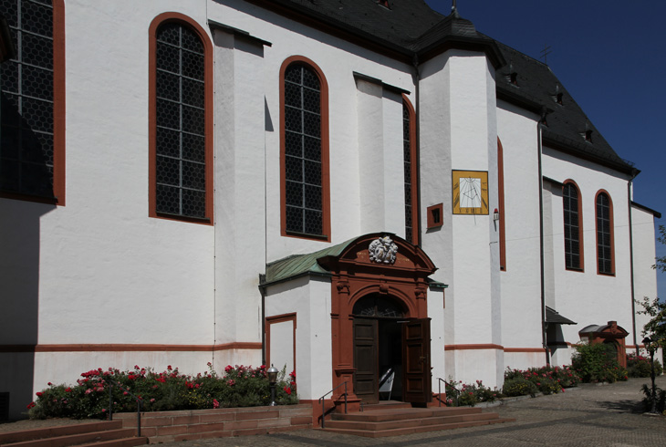 Über dem zweiten, östlichen Portikus der Südseite ist das Wappen der Herren von Greiffenclau-Vollrads angebracht; der Schild ist geviert: Feld 1 und 4: Greiffenclau-Vollrads, silbern-blau geteilt, darüber ein goldenes Glevenrad, Feld 2 und 3: Ippelbrunn = Eppelborn, in Schwarz ein silberner Schräglinksbalken). Die Herren von Greiffenclau-Vollrads besaßen hier das Kirchenpatronat. Bei der 1675 wegen zunehmender Baufälligkeit der gotischen Kirche dringend notwendig gewordenen Renovierung spielten sie als Patronatsherren eine wichtige Rolle. Dennoch war die finanzielle Zuständigkeit für die Baukosten Streitgegenstand, denn die Herren von Greiffenclau-Vollrads verwiesen darauf, daß für die Renovierung eigentlich das Stift St. Victor in Mainz zuständig sei. Daß sie wegen der Dringlichkeit des Zustandes mit der Renovierung anfingen, beginnend im Chor, bedeutete nicht automatisch, daß sie bereit waren, die Kosten zu übernehmen. Vielmehr gingen sie vor Gericht und erwirkten dort, daß die Kosten für die Renovierung vom Stift St. Victor zu tragen waren.