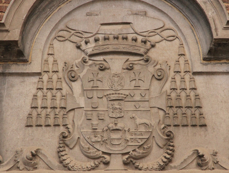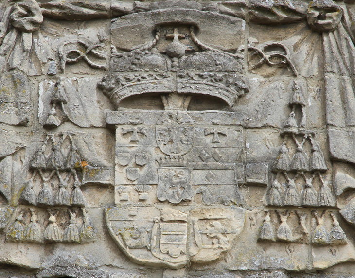 Das Wappen dieses Landkomturs kommt an zwei Stellen vor, einmal in situ am Glockenturm (ehemals sogar an allen vier Seiten), und einmal als Spolie im kleinen Lapidarium rechterhand in der Durchfahrt zum Wasserschloß-Innenhof.