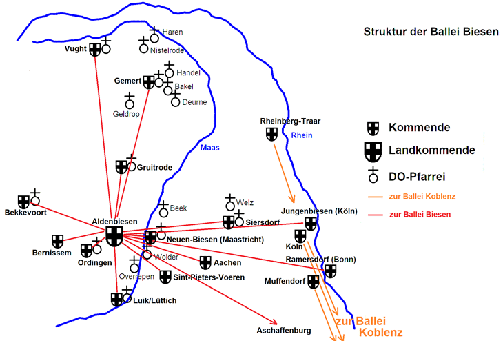 Alden-Biesen war das Zentrum der Ballei Biesen (gehörte mit der Ballei Utrecht zu den "Partes inferiores") und der Amtssitz des Landkomturs. Die Besitzungen und Kommenden dieser Ballei verteilten sich über die südlichen Niederlande, Belgien und das Rheinland, wobei es regionale Überlappungen mit der Kammerballei Koblenz gab (Kommende Muffendorf bei Bonn, Kommende Köln (St. Katharina, seit 1600 Hauptsitz), zeitweise Kommende Dieren, Kommende Pitzemburg in Mechelen). Der Deutschmeister residierte im Spätmittelalter bis 1525 auf der Burg Horneck, dann als Hoch- und Deutschmeister bis 1809 in Mergentheim. Die Sitze der Landkomture waren hier im Westen des Reichs Utrecht (Ballei Utrecht), Alden-Biesen (Ballei Biesen), Koblenz bzw. später Köln (Ballei Koblenz), Mülheim (Ballei Westfalen) und Trier (Ballei Lothringen). Der Besitz war allgemein zersplittert, aber insgesamt reichsunmittelbar. Die Karte unten zeigt den Zustand um 1400, als der Hochmeister noch auf der Marienburg residierte (1309-1457). Mehrere Landkommenden befanden sich früher an anderen Orten und wurden bis zu dieser Momentaufnahme verlegt, z. B. Rouffach ->Beuggen. Mehrere Landkommenden wurden in späteren Zeiten verlegt, z. B. Münster -> Mülheim, Beuggen -> Altshausen, Koblenz -> Köln. So stellt diese Karte nur eine Momentaufnahme der regionalen Ordensorganisation dar.