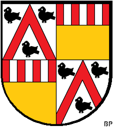 Abb.: Wasserschloß, Innenhof, unterstes Stockwerk des Glockenturms, zwei verschieden hohe Türen nebeneinander: Der Schild über der höheren Tür zeigt drei Pfähle, von einem Freiviertel überdeckt. Dieser Wappenstein aus dem 16. Jh. läßt sich Landkomtur Wynand van Breyll (amtierte 1536-1554) zuordnen. Laut Rietstap ist der Schild silbern mit drei blauen Pfählen und einem roten, golden bordierten rechten Obereck. Die Abb. unten zeigt sein Wappen einmal als reines Familienwappen wie hier am Treppenturm und einmal als Komturswappen, wie er es auch hätte führen können. Ein Vergleichswappen ist am niederländischen Kasteel Wolfrath in Holtum zu finden als Teil eines Ehewappens. Neben diesem Komturswappen befindet sich dasjenige seines Verwalters (siehe weiter unten).