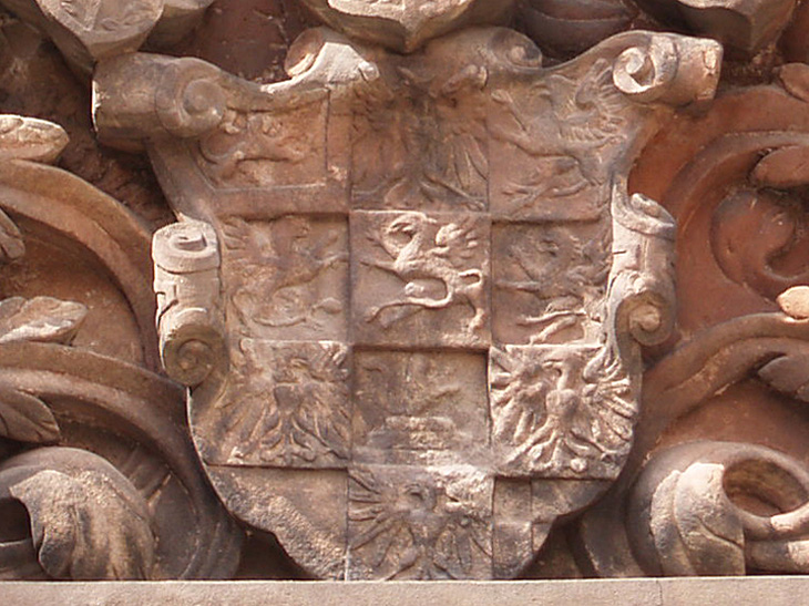 Das Wappen der Grafen von Zollern ist silbern-schwarz geviert. Das ist sozusagen die Keimzelle des gesamten Wappens, das Feld, das zuallererst da war, ehe weitere Inhalte hinzukamen, das alte Wappen der Edelfreien und seit ca. 1111 Grafen von Zollern, deren Stammländereien rund um die Burg Hohenzollern im Zollernalbkreis lagen und die sich ab Mitte des 14. Jh. von Hohenzollern nannten. Mit der Helmzier ist das eine komplexere Geschichte: Anfangs waren mehrere unterschiedliche Kleinode in Gebrauch (a) schwarz-silbern übereck geteilte Büffelhörner, b) ein schwarzes, mit goldenen gestürzten Lindenblättchen bestreutes und am oberen Rand mit Pfauenfedern bestecktes Schirmbrett). Burggraf Friedrich IV. von Nürnberg "kaufte" sich am 10.4.1317 eine neue Helmzier: Ein wachsender goldener Brackenrumpf mit roter Zunge und roten Ohren. "Vorbesitzer" war Leutold (Leupold) von Regensburg (Regensberg). Der Preis: 36 Mark Silber. Halt - hat das nicht eine erstaunliche Ähnlichkeit mit der Helmzier der Grafen von Oettingen? Richtig! Und die war älter. Entsprechend gab es auch ausgiebig Streit um die Helmzier. Wer die Kuriosität des goldenen Brackenhauptes sehen will, findet sie als Glasmalerei von 1380 in der Pfarrkirche St. Kilian in Markt Erlbach. Der Konflikt ging erst 1381 so aus, daß schließlich die Oettinger ihre Helmzier modifizierten: Die roten Ohren des Brackenrumpfes wurden mit einem Schragenkreuz belegt. Die Markgrafen tauchten ihren Bracken hingegen in die Farben ihres Stammwappens: Silbern-schwarz geviert. Ende gut, alles gut. Ab da gilt als Helmzier für das Stammwappen: auf dem Helm mit schwarz-silbernen Decken ein silbern-schwarz gevierter wachsender Brackenrumpf.