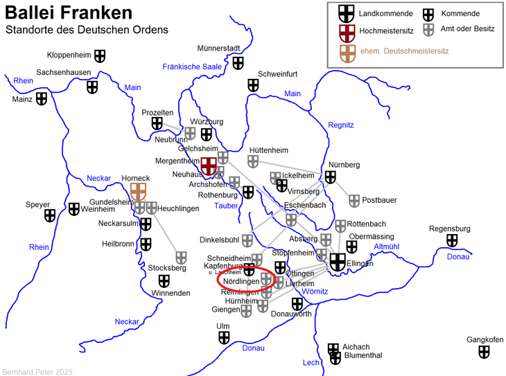 Abb.: der Deutschordensbesitz in Nördlingen im Zusammenhang mit der Deutschordensballei Franken. Nördlingen war nicht selbst Kommende (Sitz eines Komturs), sondern ein Ellingen unterstelltes Amt mit Verwaltungssitz.