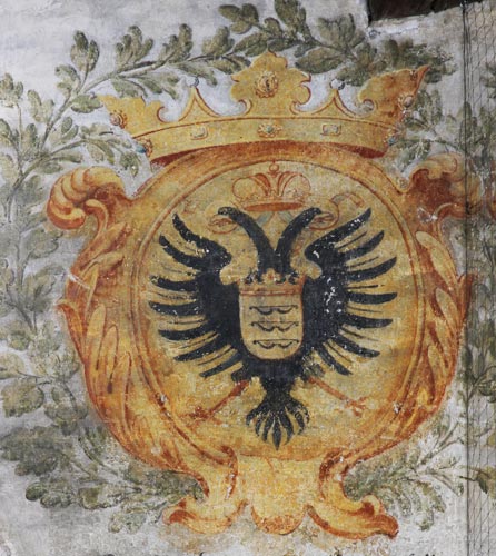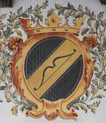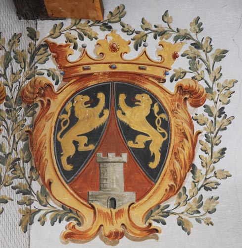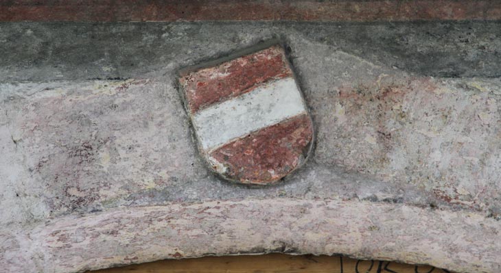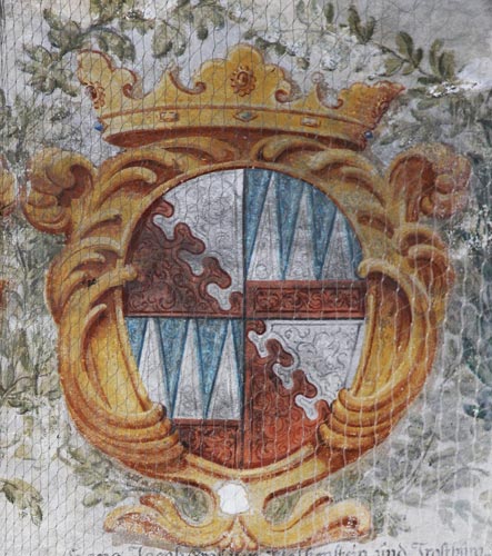 Hier ist gemäß Inschrift das Wappen von Prosper Graf von Arco dargestellt, ehem. wirklicher Kämmerer des Kaisers, Obrister, Haus- und Generalfeldzeugmeister, Kommandant, datiert 1676. Das Wappen der Grafen von Arco zeigt in Gold drei Bögen. Normalerweise sind diese drei Bögen blau und werden mit der Sehne nach unten gelegt. Dieses Stammwappen ist gekrönt und einem kaiserlichen Doppeladler auf die Brust gelegt. Die Familie war in mehreren Linien in Bayern, Schlesien, Italien und Österreich angesessen. Eine Linie zu Mantua erlosch 1917. Eine zweite Linie war in Schlesien und Preußen ansässig und vollzog einen Konfessionswechsel. Die bayerische Linie spaltete sich in einen gräflichen Zweig von Arco auf Valley (in Oberbayern) und einen ebensolchen von Arco-Zinneberg; der erstere ist erloschen, der zweite besteht noch heute. Sie hatte ausgedehnten Besitz in Südtirol, den sie 1919 gegen eine Entschädigung an Italien geben mußte. Das Wappen wird in mehreren Varianten beschrieben im Siebmacher Band: Kä Seite: 22 Tafel: 3 und in Band: OÖ Seite: 7 Tafel: 3.
