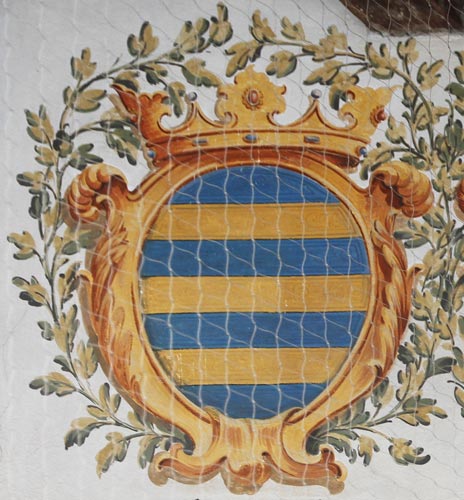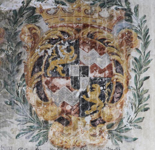 Laut Inschrift gehört das Wappen zu Francisco Girardi Freiherr von Castell, oberösterreichischer Kammerrat, Obrister der Landmiliz, Oberst-Feldzeugmeister und Kriegsrat, datiert 1643. Das Wappen der Girardi von Castell wird beschrieben im Siebmacher Band: Bad Seite: 8 Tafel: 7 und im Band Els Seite: 9 Tafel: 11. Das Wappen ist schwarz mit einer roten, eingebogenen Spitze, die (ggf. auf goldenem Grund) ein silbernes Kastell mit hier einem Zinnenturm (lt. Siebmacher drei silbernen Türmen, von denen der mittlere der höchste ist, mit Mitteltür und einem Fenster an jedem Turm) belegt ist und von zwei goldenen, einwärts gerichteten Löwen begleitet wird. Nicht dargestellt wird hier das Kleinod, das ist auf rot-silbern bewulstetem Helm mit rechts schwarz-goldenen und links rot-silbernen Decken ein wachsender goldener Löwe.
