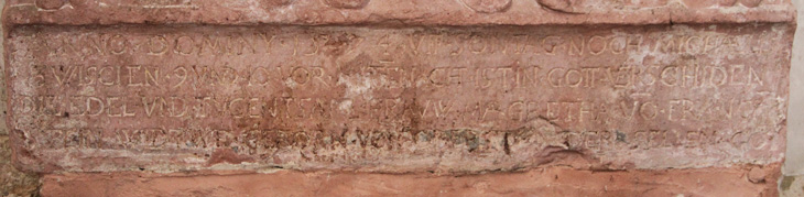 Westwand, vorgestellt werden. Das Material ist roter Sandstein.