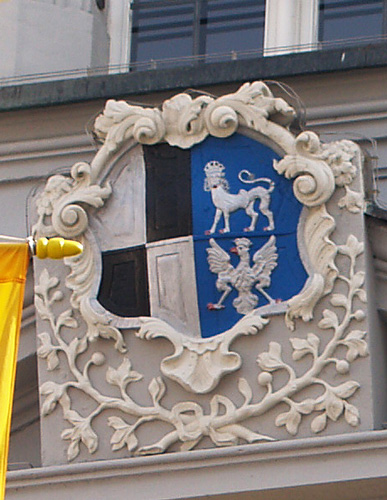 Das im Dreiecksgiebel des Obergeschosses in der Mittelachse angebrachte Wappen der Stadt Kulmbach ist gespalten, rechts silbern-schwarz geviert, links in Blau ein silberner, gekrönter schreitender Löwe über einem silbernen, gekrönten Adler. Damit spiegelt das Wappen die beiden prägenden Herrschergeschlechter wider, die Hohenzollern und die Andechs-Meranier. Das bald nach Errichtung der Plassenburg entstandene Kulmbach ist eine Gründung der Grafen von Andechs-Plassenberg. 1340 kam Kulmbach über die Grafen von Orlamünde an die Hohenzollern, Burggrafen von Nürnberg. Es gibt erst ab der Mitte des 15. Jh. städtische Siegelabdrücke, die genau diese beiden Motive kombinieren, mit der Zollernvierung rechts und links dem schreitenden silbernen Löwen in blauem Feld aus dem Wappen der Grafen von Andechs und dem silbernen Adler in blauem Feld aus dem Wappen des Herzogtums Meranien. Im Stadtbuch von 1530 gibt es sogar eine farbige Abbildung.