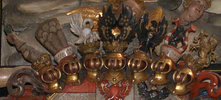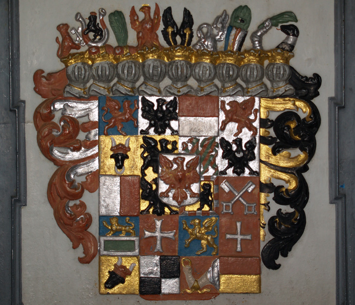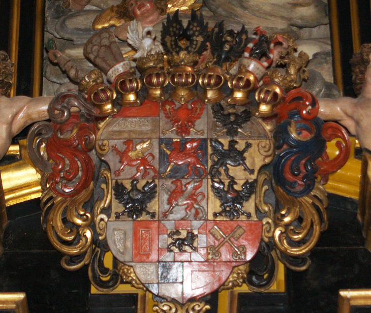 Das Wappen der Grafen von Zollern ist silbern-schwarz geviert. Das ist sozusagen die Keimzelle des gesamten Wappens, das Feld, das zuallererst da war, ehe weitere Inhalte hinzukamen, das alte Wappen der Edelfreien und seit ca. 1111 Grafen von Zollern, deren Stammländereien rund um die Burg Hohenzollern im Zollernalbkreis lagen und die sich ab Mitte des 14. Jh. von Hohenzollern nannten. Mit der Helmzier ist das eine komplexere Geschichte: Anfangs waren mehrere unterschiedliche Kleinode in Gebrauch (a) schwarz-silbern übereck geteilte Büffelhörner, b) ein schwarzes, mit goldenen gestürzten Lindenblättchen bestreutes und am oberen Rand mit Pfauenfedern bestecktes Schirmbrett). Burggraf Friedrich IV. von Nürnberg "kaufte" sich am 10.4.1317 eine neue Helmzier: Ein wachsender goldener Brackenrumpf mit roter Zunge und roten Ohren. "Vorbesitzer" war Leutold (Leupold) von Regensburg (Regensberg). Der Preis: 36 Mark Silber. Halt - hat das nicht eine erstaunliche Ähnlichkeit mit der Helmzier der Grafen von Oettingen? Richtig! Und die war älter. Entsprechend gab es auch ausgiebig Streit um die Helmzier. Wer die Kuriosität des goldenen Brackenhauptes sehen will, findet sie als Glasmalerei von 1380 in der Pfarrkirche St. Kilian in Markt Erlbach. Der Konflikt ging erst 1381 so aus, daß schließlich die Oettinger ihre Helmzier modifizierten: Die roten Ohren des Brackenrumpfes wurden mit einem Schragenkreuz belegt. Die Markgrafen tauchten ihren Bracken hingegen in die Farben ihres Stammwappens: Silbern-schwarz geviert. Ende gut, alles gut. Ab da gilt als Helmzier für das Stammwappen: auf dem Helm mit schwarz-silbernen Decken ein silbern-schwarz gevierter wachsender Brackenrumpf.
