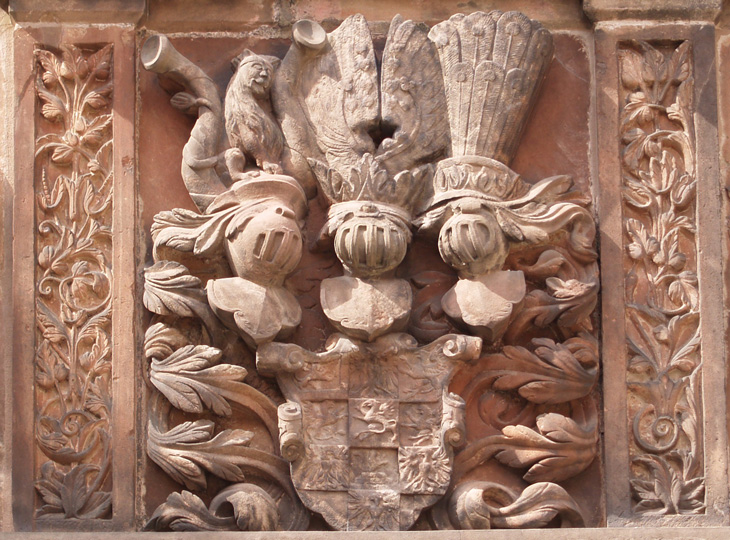 Bildbeispiel: Stiftskirche Aschaffenburg, Gedächtnisanlage für Albrecht von Brandenburg, Einzelwappen für die Grafen von Hohenzollern und das Burggrafentum Nürnberg.