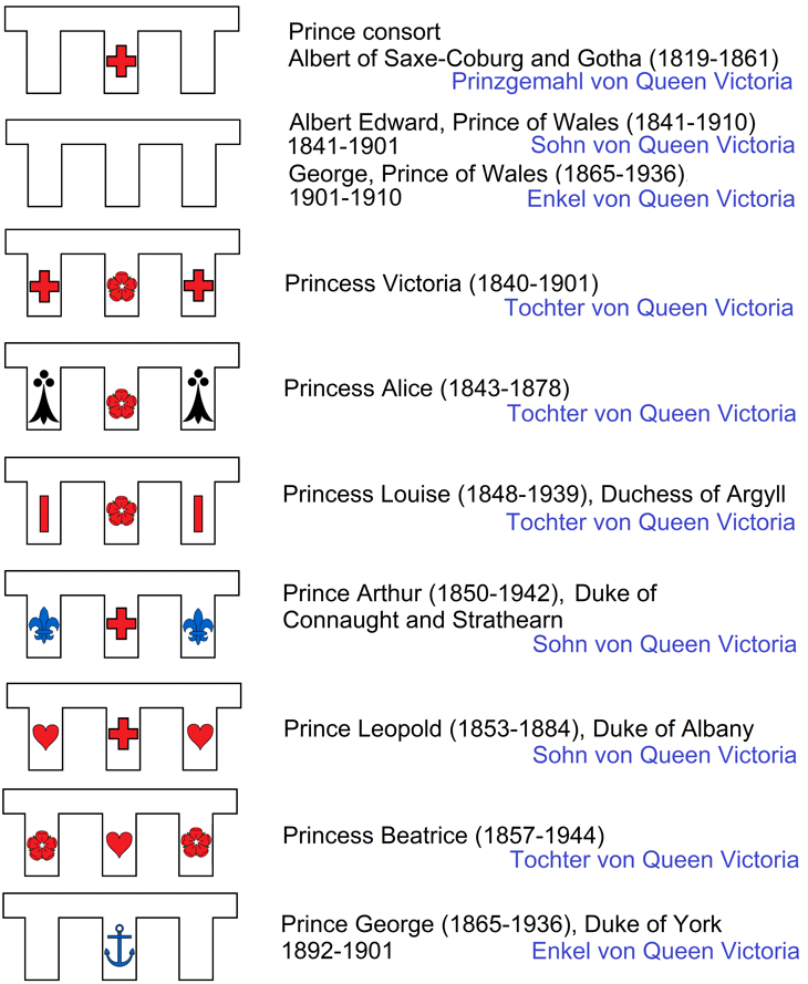 Abb.: Differenzierung der Wappen der königlichen Familie durch Turnierkragen (label) mit Beizeichen (cadency marks) am Beispiel einiger Angehöriger von Queen Victoria, Prinzgemahl, Kinder und ein Enkel, wobei letzterer in verschiedenen Lebensphasen verschiedene Turnierkragen führte, zunächst als Duke of York einen mit einem blauen Anker, dann einen ohne Beizeichen als Prince of Wales, und schließlich als König George V. gar keinen Turnierkragen mehr. Die Beispiele illustrieren die Vielfalt der Beizeichen innerhalb der königlichen Familie, die ein System für sich allein bilden.